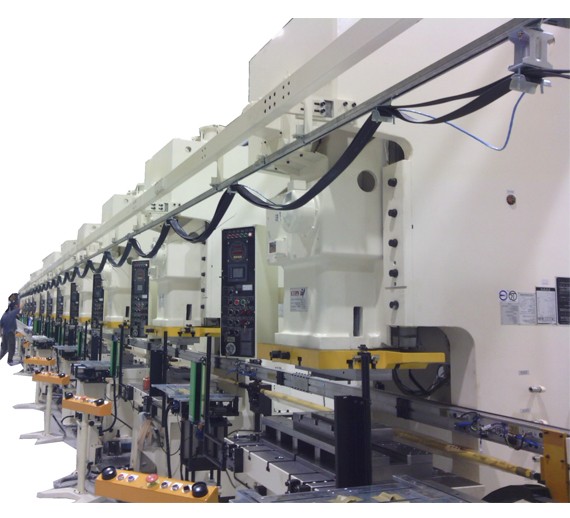 在完整的冲压自动化系统中,连杆式多工位机械手通常与多台冲床以及前端送料设备协同运行,形成高效的一体化生产线。